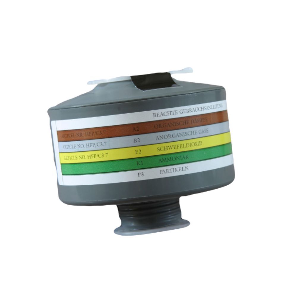 The ABEKP HAZMAT Canister is a high-performance combined filter cartridge offering protection against a wide spectrum of hazardous gases, vapours, and particulates. Classified as A2B2E2K1P3, this filter is compliant with EN 14387 and is designed for use with full-face respirators in industrial and emergency response environments.