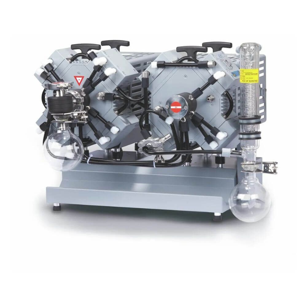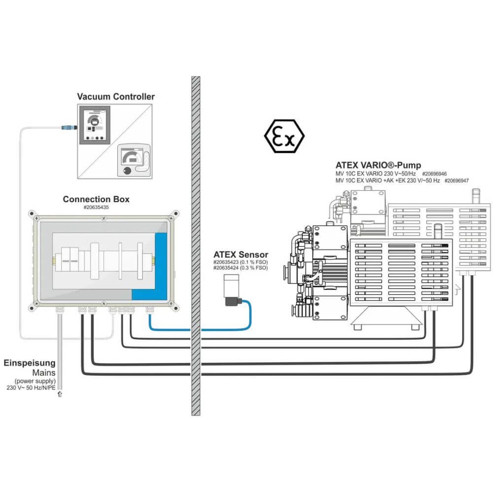 With the new ATEX VARIO® chemistry diaphragm pumps and vacuum systems, the vacuum can be precisely controlled by the motor speed. The VARIO® pump is driven by an additional control signal line. The optional vacuum controller VACUU·SELECT with ATEX vacuum sensor and Connection Box 100 enables fully automatic evaporations without the need for parameter settings or user programming. With the adaptive control, it finds the boiling pressure independently and adjusts the vacuum continuously and optimally according to the vapour pressure. The vacuum controller and the Connection Box 100 are installed in a non-hazardous area.