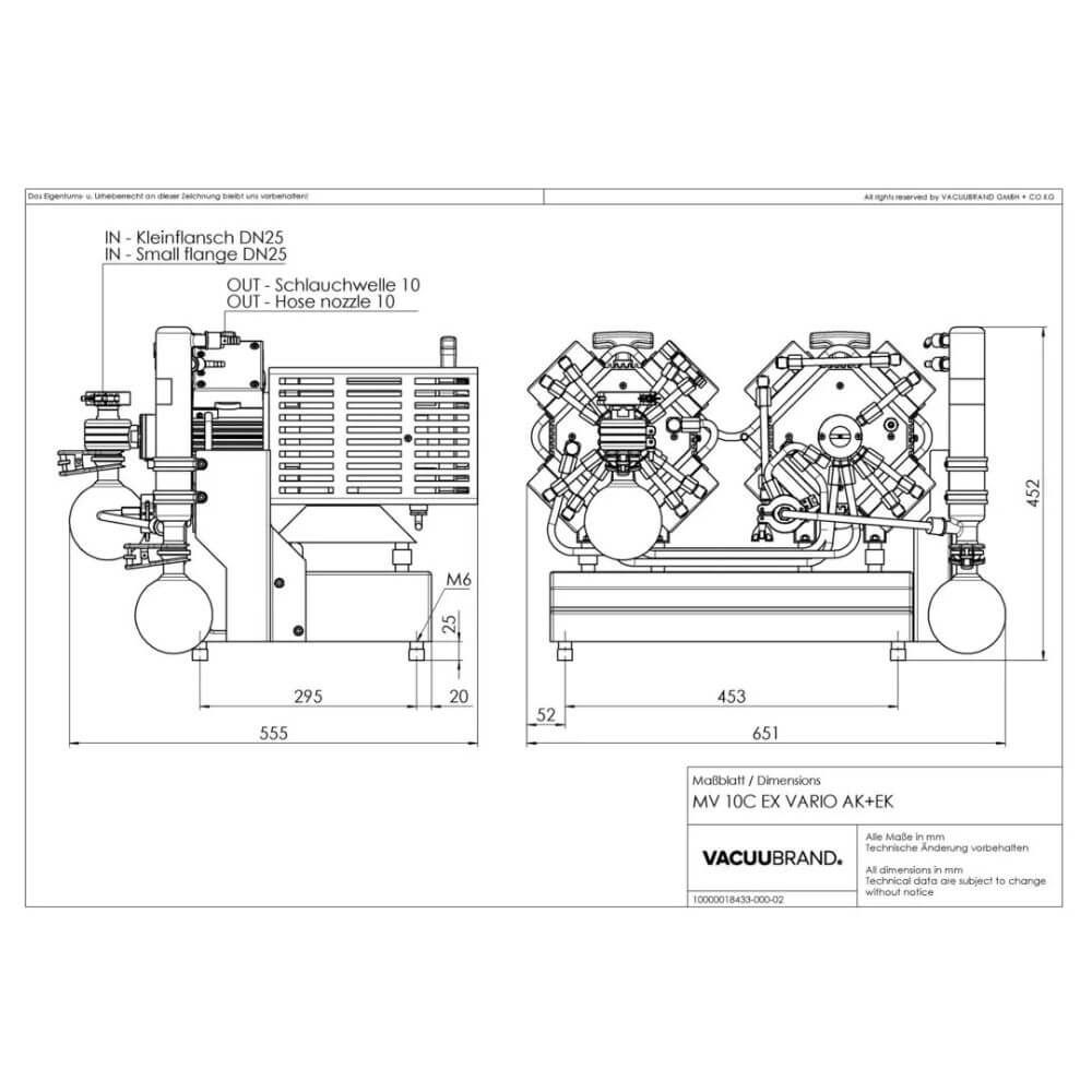 Pumping unit with two motors (with control and mains cables at each of the two motors) and inlet separator and emission condenser completely mounted, with manual. Shatter and shock protection for glass parts is to be provided by the customer. Speed control via 4-20 mA current loop (4 mA = 0 rpm, 20mA = 1500 rpm). Control signal and mains cable length 10 m, without plugs. Additional devices are required for operation, such as a connection box and controller.