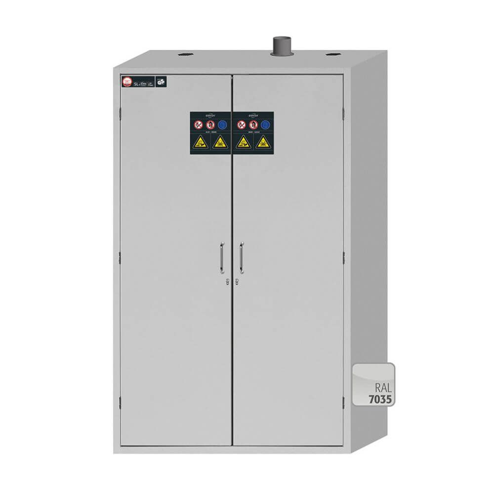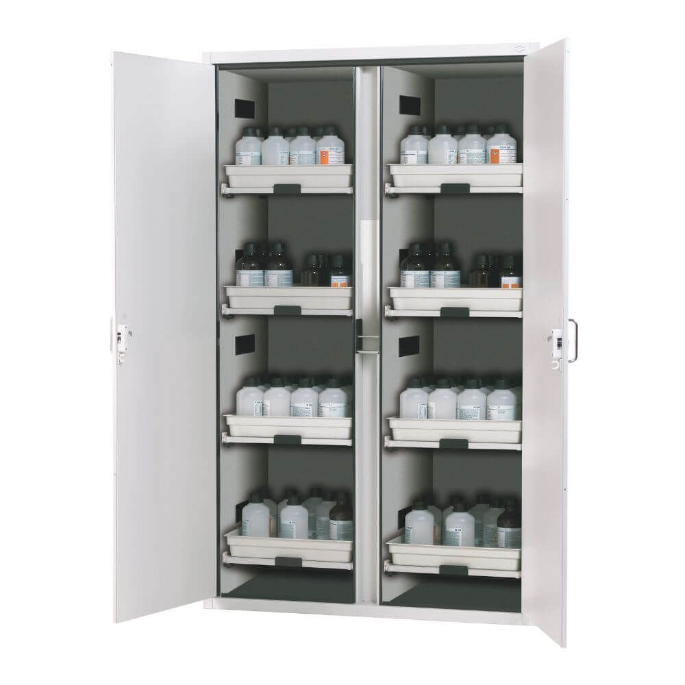 Tall cabinet with body made of powder-coated sheet steel and interior space made of melamine resin and flame retardant special plates. Acids and alkalis can be stored safe and separately. Two hermetically divided storage compartments; vertical or horizontal dividing wall; integrated aeration and venting system; corrosion resistance of the metal-free air ducts.