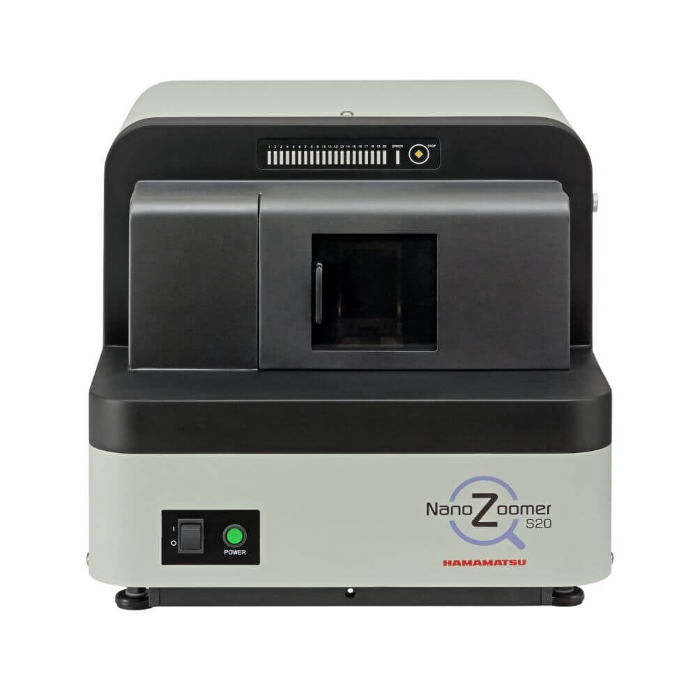 The NanoZoomer® S20 is a compact, benchtop whole slide scanner designed for fast, high-resolution digitisation of glass slides. Ideal for research applications, it combines speed, image quality, and workflow scalability in a space-saving footprint.